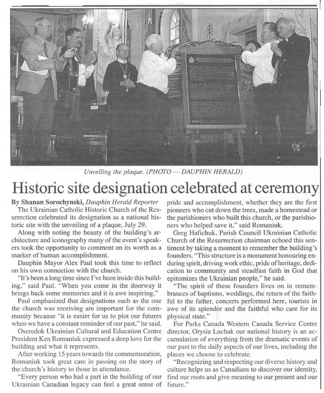 "Побудована між 1936 і 1939 роками, церква Воскресіння є гордим свідченням культурної і духовної сили українських поселенців в околицях Давфину. Цю "катедру прерій" запроєктував один із перших будівничих українських церков у Канаді монсеньйор Філіп Ру, Ч.О., а інтер'єр розписав мистець Теодор Баран у 1957 - 1958 рр. Архітектура церкви з її багатьма куполами і характерним інтер'єром базується на архітектурі київських церков в Україні та на століттях традиції візантійської іконографії." |